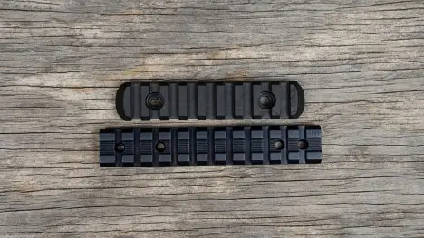 Comparing a Magpul Picatinny rail (top) with a Weaver rail (bottom). In practice, this means attachments made strictly to Picatinny specs won’t fit onto a Weaver rail – their locking lugs are too wide for the Weaver slots. However, any accessory designed for a Weaver rail will usually fit fine on a Picatinny rail (the Weaver’s smaller crossbolt can slide into the Picatinny’s larger slot).